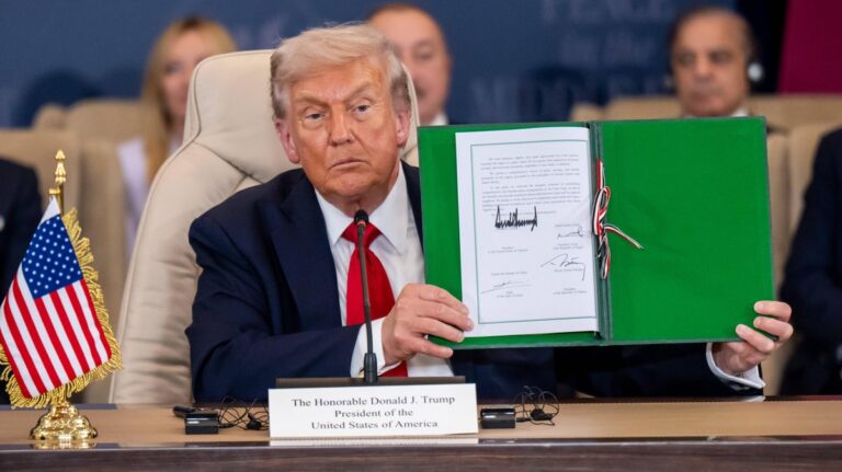 Donald Trump a signé lundi, lors d’un sommet sur Gaza en Egypte, un accord avec le Qatar, l’Egypte et la...