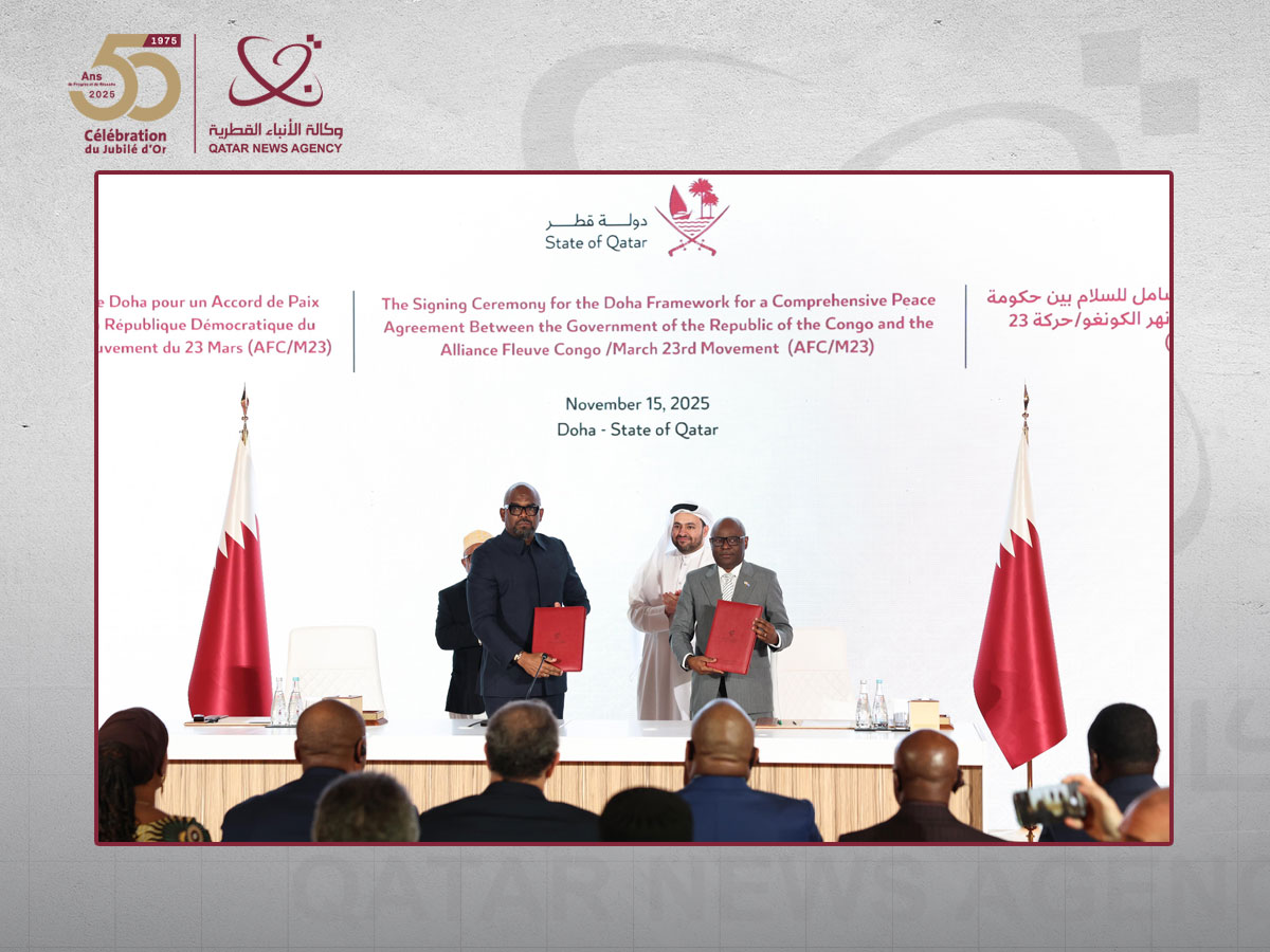 Doha, le 15 novembre /QNA/ L’État du Qatar a annoncé aujourd’hui la signature de l’Accord-cadre de Doha pour la paix entre le Gouvernement de la République démocratique du Congo et l’Alliance du fleuve Congo (Mouvement M23).